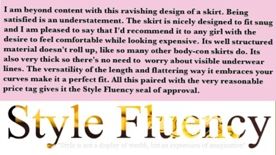 I am beyond content with this ravishing design of a skirt. Being satisfied is an understatement. The skirt is nicely designed to fit snug and I am pleased to say that I'd recommend it to any girl with the desire to feel comfortable while looking expensive. Its well structured material doesn't roll up, like so many other body-con skirts do. Its also very thick so there's no need to worry about visible underwear lines. The versatility of the length and flattering way it embraces your curves make it a perfect fit. All this paired with the very reasonable price tag gives it the Style Fluency seal of approval.