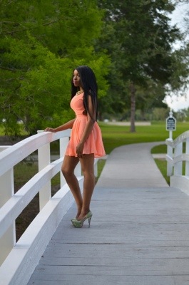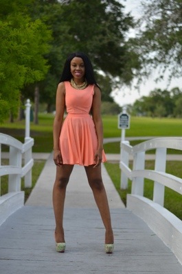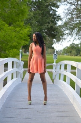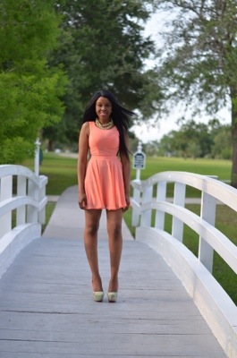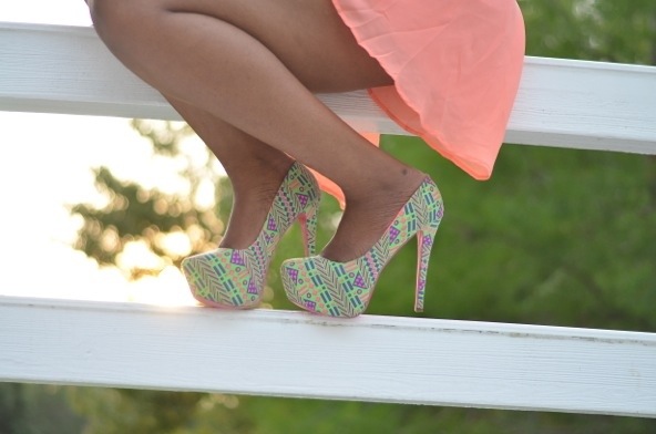 Beautiful, coral works on you. I love the fun skirt and the heels, good job!